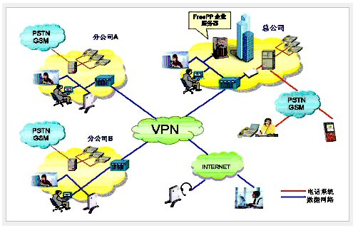 FreePP獨有的群組功能可以幫助企業(yè)將其總部與分支機(jī)構(gòu)原本各自獨立的若干個PBX整合成為一個PBX,實現(xiàn)Internet、PSTN網(wǎng)絡(luò)上通信應(yīng)用的融合,幫忙企業(yè)擺脫對傳統(tǒng)通信運營商的依賴,完全掌握自己的通信網(wǎng)絡(luò)。通過為PBX外線上的若干個FreePP Box (或MPES)分配一個Group Number,PBX內(nèi)線上的分機(jī)按照PBX上的設(shè)定來獲取Group Number中的一個FreePP Box,進(jìn)而通過這個FreePP Box來呼叫另外一組Group Number 連接的PBX分機(jī)號碼。他們相互間的通信完全基于Internet實現(xiàn),無需象傳統(tǒng)方式那樣交納通信費用。
