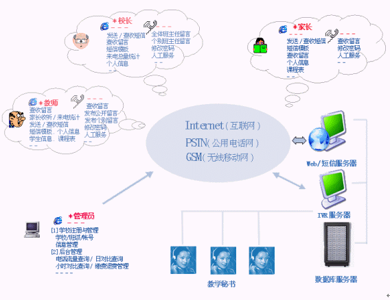 | 發(fā)送/查收短信< | 可以在INTERNET實(shí)時(shí)對(duì)本校所有班主任或個(gè)別班主任發(fā)送短信。也可接收其他人發(fā)送給自己的短信 |