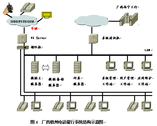 廣西工行推出的第一套銀行呼叫中心系統(tǒng)是在潤聲VX綜合信息系統(tǒng)開發(fā)平臺(UNIX版)上,在較短時間內(nèi)開發(fā)成功,首先在梧州分行開通運行,獲得用戶的一致好評,并希望與潤聲公司進一步合作。該系統(tǒng)的結構如圖4所示。