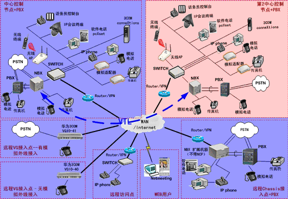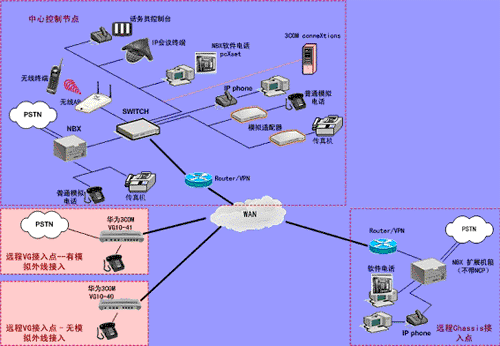 ③.遠(yuǎn)程接入的辦公室不再需要專用的 PBX, 只需要將3Com NBX電話終端接入到WAN網(wǎng)中,就能地實現(xiàn)在WAN或Internet上與3Com NBX 網(wǎng)絡(luò)電話系統(tǒng)的互連。