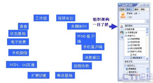 UcSTAR :Unified Communication Star,是深圳市擎旗信息技術(shù)有限公司推出的企業(yè)級(jí)融合通信平臺(tái)。是融合多種通訊手段(IM、文件、視頻、語(yǔ)音、EMAIL、SMS、電話、VOIP、MSN/QQ互通),融合企業(yè)的多種應(yīng)用系統(tǒng)緊密集成(OA、CMS、ERP、EIP、Portal、網(wǎng)站、應(yīng)用軟件),交流對(duì)象和交流內(nèi)容可管理,可控制,可擴(kuò)展,輕松實(shí)現(xiàn)部署企業(yè)的統(tǒng)一工作平臺(tái)。 UcSTAR能統(tǒng)一消息、統(tǒng)一溝通、統(tǒng)一管理、隨意選擇多種溝通手段,深航一直在找這樣的一種產(chǎn)品,公司信息部門從上到下給予極高的重視,商務(wù)的過(guò)程也都開了綠燈,一路順暢。