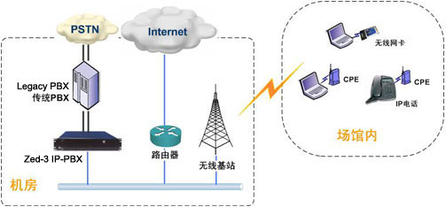 - 在網(wǎng)通機(jī)房部署一臺(tái),提供和管理語(yǔ)音通信服務(wù)。IP話機(jī)連接到無(wú)線終端,經(jīng)過(guò)無(wú)線網(wǎng)絡(luò)注冊(cè)到Zed-3 IP-PBX,可進(jìn)行內(nèi)部分機(jī)的免費(fèi)呼叫,并可利用Zed-3