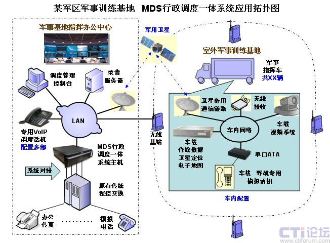 為了加強(qiáng)現(xiàn)代化軍隊(duì)的建設(shè),某軍區(qū)在其軍分區(qū)的指揮訓(xùn)練基地,使用先進(jìn)的技術(shù),搭建了一套由幾十輛軍事指揮車組成的作戰(zhàn)指揮訓(xùn)練系統(tǒng),其中的語音通信指揮系統(tǒng)部分,采用了美國Zed-3公司最先進(jìn)的基于IP技術(shù)的MDS80行政調(diào)度一體化通信系統(tǒng),解決了訓(xùn)練基地的指揮中心大樓的原有通信系統(tǒng),與室外的訓(xùn)練基地各輛指揮車之間,通過基地?zé)o線網(wǎng)絡(luò)及衛(wèi)星備份鏈路提供的IP通道,實(shí)現(xiàn)語音的指揮調(diào)度通信,達(dá)到訓(xùn)練基地要求的最佳的語音指揮調(diào)度通信效果。