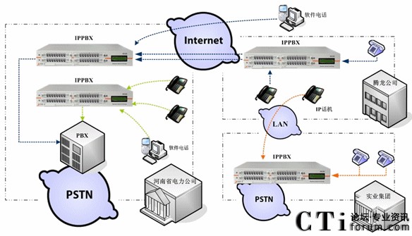 · “騰龍公司”需要組建內(nèi)部電話網(wǎng),并且可以與“河南電力”進行VoIP通話。可以進行電話會議;