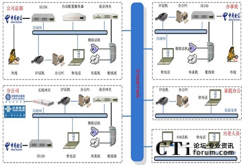 - 分布式部署:總部和各分支機(jī)構(gòu)的分機(jī),是通過(guò)IP網(wǎng)絡(luò)融合在一個(gè)語(yǔ)音平臺(tái)上來(lái)實(shí)現(xiàn)內(nèi)部通信?偛亢娃k事處分機(jī)、家庭辦公分機(jī)、出差人員的軟電話均注冊(cè)在總部的SE150上,各分公司的分機(jī)注冊(cè)在本地的SE150上,由本地的SE150管理。