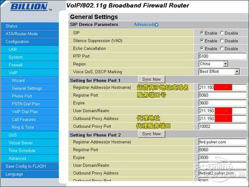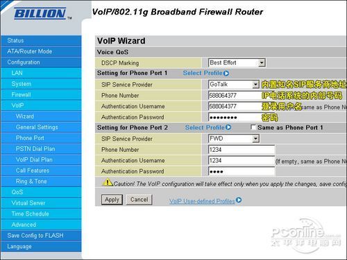 把申請(qǐng)得到的相關(guān)數(shù)據(jù)填入BiPAC 6404VGP中,在路由器后面接上電話就可以享受完全免費(fèi)或超低價(jià)格的電話服務(wù)了。同一個(gè)SIP服務(wù)器下面的用戶互相撥打電話、收發(fā)傳真是免費(fèi)的。