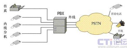 目前大多數(shù)企業(yè)使用PBX基于PSTN網(wǎng)絡(luò)組建內(nèi)部電話系統(tǒng),如下圖: