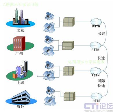 各分支機構(gòu)租用獨立的電話號碼并接入當(dāng)?shù)豍STN,在這種架構(gòu)下,各地之間通話就會產(chǎn)生長途費用,并占用電話線路,但如果使用IP