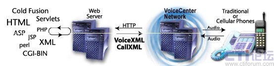 類(lèi)似地,在Voxeo網(wǎng)絡(luò)上,語(yǔ)音應(yīng)用遵從與標(biāo)準(zhǔn)Web頁(yè)面相同的瀏覽器模型。所不同的是,不是采用HTML,而是使用電話標(biāo)記語(yǔ)言(VoiceXML、CCXML或CallXML)來(lái)編寫(xiě)頁(yè)面。經(jīng)過(guò)Voxeo VoiceCenter網(wǎng)絡(luò)的處理,這些頁(yè)面將把語(yǔ)音返回給呼叫方。如下圖所示: