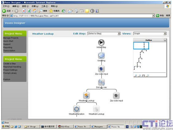 Home,在打開(kāi)的Voxeo Prophecy網(wǎng)頁(yè)中點(diǎn)擊Prophecy Designer即開(kāi)始了我們創(chuàng)建VoiceXML項(xiàng)目的輕松之旅。該設(shè)計(jì)工具將整個(gè)VoiceXML應(yīng)用以圖表或樹(shù)狀結(jié)構(gòu)直觀地呈現(xiàn)給開(kāi)發(fā)者,可以方便地控制和修改其交互流程,如圖3所示。