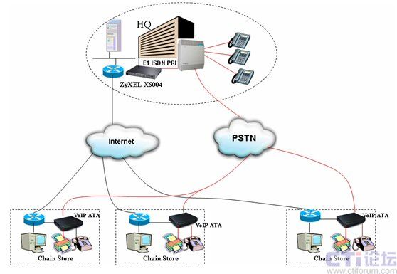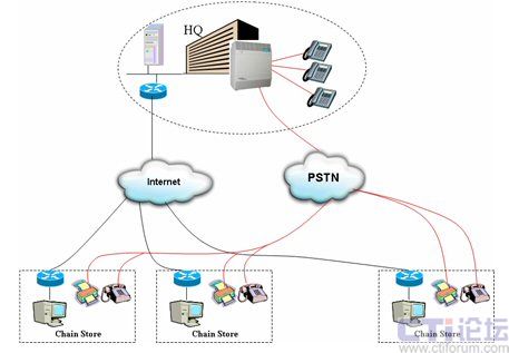 通過這種架構(gòu),各連鎖分店的話機與總部內(nèi)部話機之間的聯(lián)系便可以透過IP網(wǎng)絡進行,無須再支付任何長途通話費用。