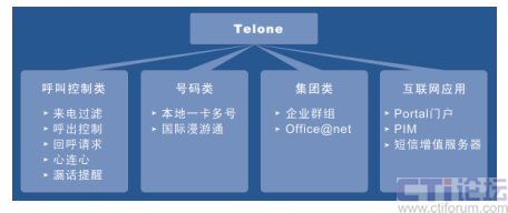 作為智能網(wǎng),Telone平臺(tái)可對(duì)外提供PPS(預(yù)付費(fèi)業(yè)務(wù))、移動(dòng)群組(M800)、被叫付費(fèi)(800)、來話過濾等業(yè)務(wù)、國際漫游通。