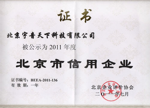 CTI論壇(ctiforum)7月12日消息(記者 張潔):2011年7月,經(jīng)過(guò)北京企業(yè)評(píng)價(jià)協(xié)會(huì)組織的專家共同審議,北京宇音天下公司順利獲得了北京市信用企業(yè)證書。