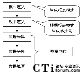 報(bào)表生成流程分為模式定義、規(guī)則定義和數(shù)據(jù)制作三個(gè)部分。規(guī)則定義需要引用模式定義的結(jié)果,而數(shù)據(jù)制作需要引用規(guī)則定義的結(jié)果。因此,需要遵循模式定義――規(guī)則定義――數(shù)據(jù)制作的順序過程。其流程如圖3.10所示。