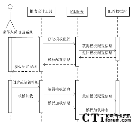在ETL服務(wù)運(yùn)行時(shí),首先它會(huì)從配置數(shù)據(jù)庫(kù)中獲取模板的配置信息,并且根據(jù)其配置信息從ODS源數(shù)據(jù)庫(kù)中抽取數(shù)據(jù)。ODS源數(shù)據(jù)庫(kù)中的數(shù)據(jù)是狀態(tài)服務(wù)器從呼叫中心中獲得的。在ETL抽取數(shù)據(jù)后對(duì)其進(jìn)行轉(zhuǎn)換和加工,將其加載到報(bào)表數(shù)據(jù)庫(kù)中。并利用報(bào)表展現(xiàn)工具將報(bào)表數(shù)據(jù)展現(xiàn)出來。其最終設(shè)計(jì)的系統(tǒng)各部件交互時(shí)序圖如圖3.5所示。