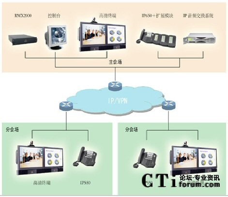 每個(gè)會場分配一個(gè)專用的IP地址,終端設(shè)置一部Polycom IP550電話, 在中心會場的指揮電話及擴(kuò)展模塊上設(shè)置每個(gè)分會場快速呼叫功能鍵,中心會場的管理人員只需按下IP650及擴(kuò)展模塊上的對應(yīng)于各分會場的快捷按鍵,即可迅速接通各個(gè)分會場。