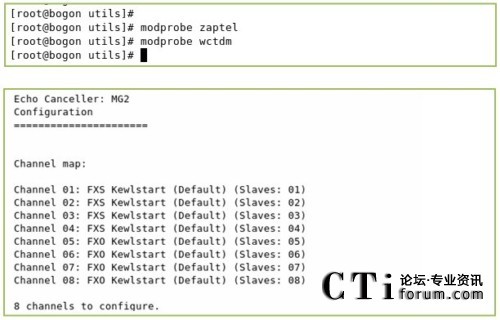 上面的輸出表示A1200P的通道都已識別,驅(qū)動安裝成功(本文用的是8個FXS口,上面的channel 01到channel 08是FXs口,后面的FXO表示它們使用的是FXO的信令,并不是表示它們是FXO口,這一點大家應(yīng)該注意)