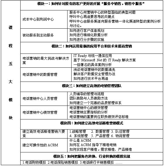 本課程以系統(tǒng)化的眼光,結合多個國際國內領先企業(yè)的營銷與管理實踐案例,與您分享國內領先的呼叫中心和電話營銷中心的戰(zhàn)略與運營經(jīng)驗,對現(xiàn)有資源進行合理評估,解決實際問題與困惑,突破面臨的瓶頸,整個課程具有高度的實戰(zhàn)性與可操作性。