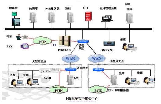 中心點和分支點的客服系統(tǒng)通過兩地的語音網關進行語音連接,具體實現大概是,如果分支點需要把語音轉接到中心點,分支點把TDM語音轉接到語音網關,語音網關把TDM語音信號轉變?yōu)镮P包,通過網絡發(fā)送到中心點的語音網關上,語音網關把IP包變?yōu)門DM語音信號,在接入到交換機上,由中心點CTI按照指定的策略轉接到最終目標上。