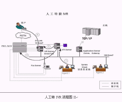 典型的客戶電話從人工服務轉接IVR的物理流程如下:
