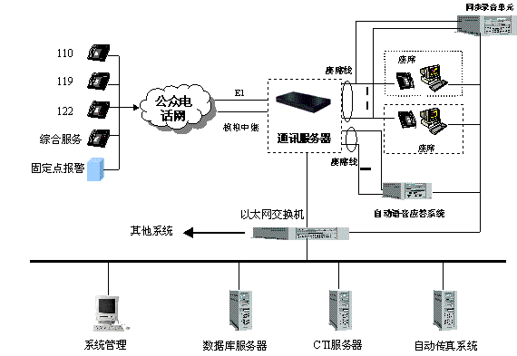 。1).110、119、122報警電話的傳送與集中接聽模式:所有轄區(qū)以內(nèi)的110、119、122報警電話都經(jīng)市電信局統(tǒng)一匯接,通過一條PCM2MBPS數(shù)字中繼送往市局指揮中心hxd09可編程智能語音交換機(簡稱交換機,下同)。再由交換機經(jīng)過數(shù)模轉(zhuǎn)換、排隊分配等處理后送往指揮中心各受理臺。此外,系統(tǒng)還備用了4條專用的模擬中繼線,用于當(dāng)PCM數(shù)字鏈路發(fā)生意外時,作為傳送110、119、122報警電話的應(yīng)急備用專線。