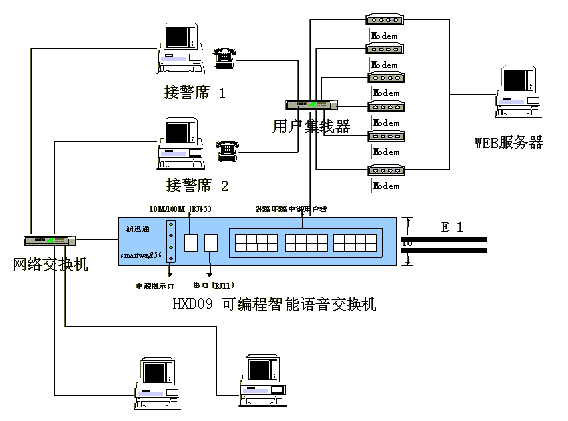 綜合接警平臺主要由hxd09可編程智能語音交換機和計算機網(wǎng)絡(luò)兩部分組成,交換機負(fù)責(zé)110、119、122報警電話的接入與分流及調(diào)度呼出等功能;計算機網(wǎng)絡(luò)則完成110、119、122報警信息的顯示、數(shù)據(jù)儲存、統(tǒng)計及信息查詢、發(fā)布功能。