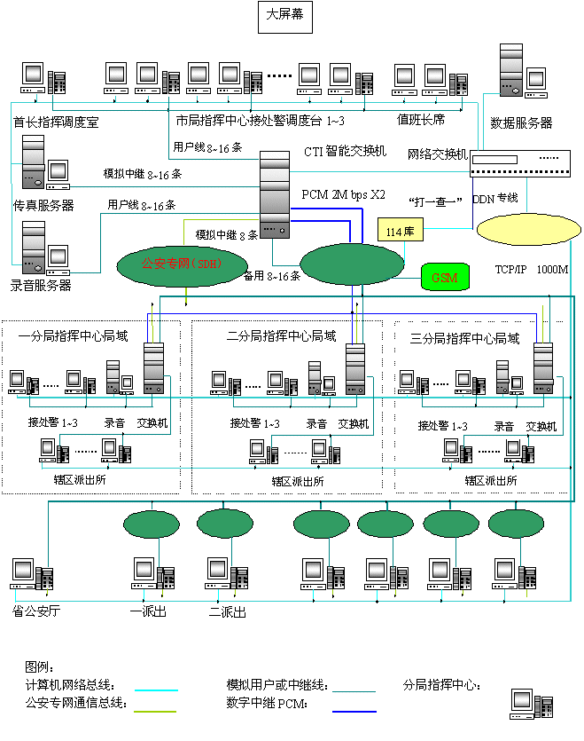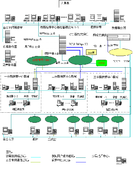 樹立大網(wǎng)絡(luò)概念:采用先進的通訊、計算機網(wǎng)絡(luò)技術(shù)(采用CTI可編程交換技術(shù)),利用現(xiàn)有的通信資源,實現(xiàn)市局指揮中心與消防大隊、交警大隊、各派出所的計算機網(wǎng)絡(luò)及相關(guān)領(lǐng)導(dǎo)辦公室計算機大聯(lián)網(wǎng);形成全市范圍內(nèi)110、119、122有線、無線全方位立體調(diào)度語音通道大網(wǎng)。