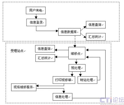 維修點對用戶的報修情況進(jìn)行預(yù)處理之后,根據(jù)用戶所在的區(qū)域,分配至最近距離的維修站,將用戶與其報修信息即時轉(zhuǎn)移,這也就是圖中所顯示的"轉(zhuǎn)站處理"。之后,維修站將直接打印出報修單,加快服務(wù)實施的效率、減少人工出錯的比例,有專業(yè)人員及時上門服務(wù)檢修。