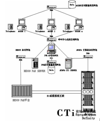 HXD09交換機(jī)通過E1上的信令完成控制話路,同時由FAX/IVR SERVER完成業(yè)務(wù)控制如放音、收號、收發(fā)傳真等。
