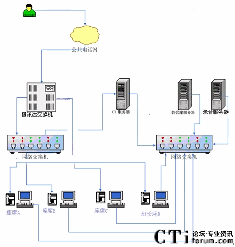 根據(jù)以上業(yè)務(wù)設(shè)計(jì)框架,我們確定了客服中心搭建時(shí)所需要的設(shè)備,系統(tǒng)的網(wǎng)絡(luò)拓?fù)浣Y(jié)構(gòu)圖如下: