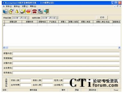 指揮中心信息查詢系統(tǒng)基于客戶/服務(wù)器方式。支持全中文檢索及模糊查詢、組合條件查詢、記錄瀏覽查詢、綜合查詢、提供指揮中心與信息中心間數(shù)據(jù)的雙向數(shù)據(jù)流動(dòng)等功能。還可對120相關(guān)信息進(jìn)行錄入、分類、保存、歸檔、管理維護(hù),并提供檢索及查詢、綜合匯總、報(bào)表生成、統(tǒng)計(jì)打印及發(fā)送給領(lǐng)導(dǎo)審閱等功能,并可跟蹤值機(jī)人員對120報(bào)警的受理急救、指揮的每一步驟的處理情況。