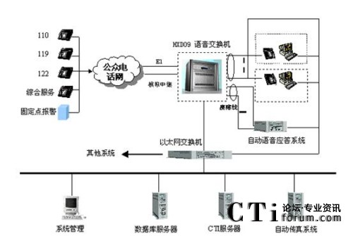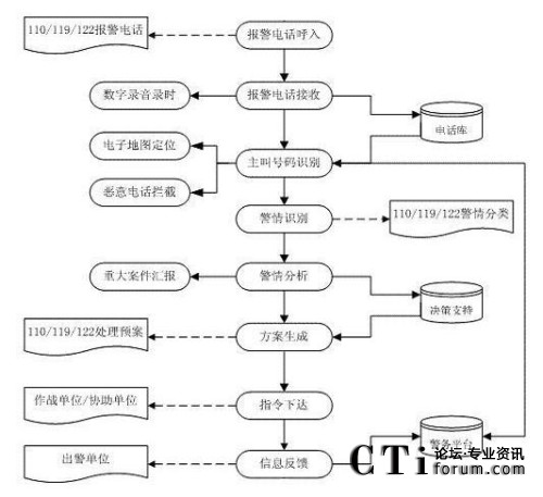 該系統(tǒng)主要分為電信子系統(tǒng)(完成聯動中心與各電信公司之間話音的傳輸、交換和分配,以及主叫號碼和主叫地址的自動查詢和傳輸等)、接警中心子系統(tǒng)(統(tǒng)一接聽和處理市民的報警、求助電話)、指揮調度子系統(tǒng)(或稱為處警中心,通過直觀的地理信息系統(tǒng)和數據庫,可以對所有的資源和警力分布了如指掌。通過一體化的無線數據傳輸和無線調度臺進行方便的統(tǒng)一管理,指揮和調度)、信息網絡子系統(tǒng)(聯動中心的骨干網絡,把各種數據數庫、接處警席位、移動的警用車載計算機等互聯在一起,形成一個強大的信息網絡)、無線指揮調度通信子系統(tǒng)、大屏幕顯示子系統(tǒng)、地理信息子系統(tǒng)、GPS/GIS子系統(tǒng)。