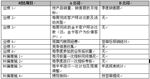 顯然,兩家公司在經(jīng)營(yíng)業(yè)績(jī)和人員規(guī)模上有差不多的基礎(chǔ),但兩家所處的行業(yè)和性質(zhì)有明顯不同,如何評(píng)估兩家企業(yè)精細(xì)營(yíng)銷的管理效益呢?我們?cè)僖员?反映兩家公司對(duì)業(yè)務(wù)代表工作指標(biāo)及糾偏: