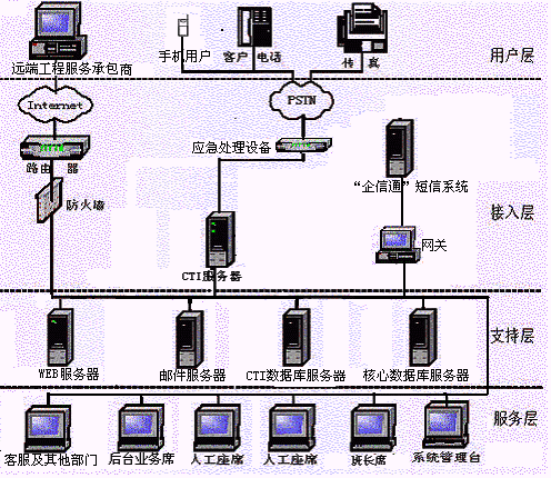 寬帶信息公司目前已建立了完善的客戶(hù)資料管理體系,能夠受理客戶(hù)客戶(hù)的業(yè)務(wù)受理、咨詢(xún)、投訴建議等,并有自己的郵件服務(wù)器和"企信通"短信服務(wù)器,因此,應(yīng)當(dāng)充分利用公司已有的系統(tǒng)設(shè)備,綜合公司實(shí)際的業(yè)務(wù)管理需要,客戶(hù)服務(wù)中心的熱線(xiàn)系統(tǒng)采用C/S三層體系結(jié)構(gòu),而后臺(tái)、客戶(hù)服務(wù)部門(mén)及其他部門(mén)之間的采用B/S體系結(jié)構(gòu),實(shí)現(xiàn)投訴事件在公司內(nèi)部各部門(mén)的傳遞、跟蹤管理,從而整合公司各部門(mén)資源為用戶(hù)及時(shí)周到的提供全程服務(wù)。