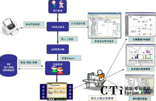 用戶(hù)電話(huà)呼入時(shí),系統(tǒng)通過(guò)自動(dòng)語(yǔ)音應(yīng)答的方式,實(shí)現(xiàn)用戶(hù)服務(wù)的自動(dòng)導(dǎo)航。交互式語(yǔ)音應(yīng)答功能自動(dòng)播放問(wèn)候和語(yǔ)音提示信息,根據(jù)用戶(hù)按鍵選擇提供自助服務(wù)或者呼叫中心人工服務(wù)。呼叫中心提供人工服務(wù)后還可以為特定的用戶(hù)需求提供人工轉(zhuǎn)IVR自動(dòng)語(yǔ)音服務(wù),比如114查詢(xún)到電話(huà)、地址后,電信10000號(hào)呼叫中心提供的語(yǔ)音播放服務(wù)。