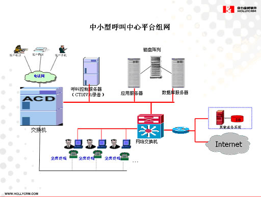 中小型呼叫中心平臺具有較強(qiáng)的擴(kuò)展能力,可以支持100座席左右的呼叫中心,每天的呼叫處理量在5000~10000人/次。當(dāng)您希望建設(shè)一個中小規(guī)模、成本相對低廉、實(shí)施方便、快速、配置靈活的呼叫中心可以考慮采用HOLLYCRM中小型呼叫中心解決方案。