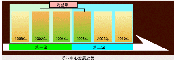 在合力金橋軟件公司的副總裁盧毅看來,1998年以前是呼叫中心在中國市場的導入期,1998~2005年第一波呼叫中心的建設(shè)期,直接促成了整個市場的擴大和呼叫中心座席數(shù)的大幅增加;在2006年~2010年,由于受到中國加入WTO、2008年北京舉辦奧運會、2010年上海舉辦世界博覽會等社會政治、經(jīng)濟事件的推動,將會出現(xiàn)第二波的呼叫中心建設(shè)風潮;而從2002年~2006年中期是個調(diào)整期,第一波的呼叫中心建設(shè)此時進入運營期和消化期,同時為第二波的建設(shè)應(yīng)用積蓄力量。
