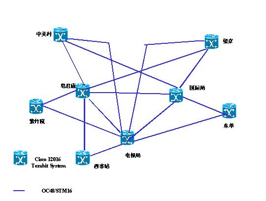 北京電信公眾IP網(wǎng)的骨干節(jié)點構(gòu)成的骨干網(wǎng)拓撲情況如圖: