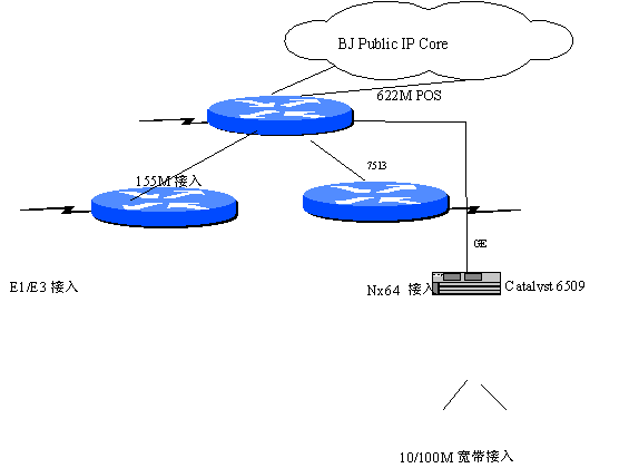 北京電信公眾IP網(wǎng)中,骨干網(wǎng)核心節(jié)點路由器為業(yè)界最 先進的新一代電信級高性能的路由交換機 Cisco GSR 12016太比特系統(tǒng); 邊緣節(jié)點路由器為GSR 12008,Cisco 7513;10/100M局域網(wǎng)接入設備為Catalyst 6509交換機。