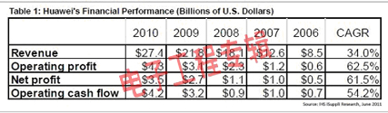 華為已經(jīng)取得了強(qiáng)大的地位,國(guó)內(nèi)外銷售均快速增長(zhǎng)。該公司過(guò)去四年?duì)I業(yè)收入增長(zhǎng)了兩倍以上,2010年?duì)I業(yè)收入從2006年的85億美元上升到274億美元。