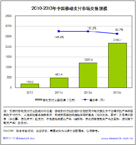 艾瑞咨詢數(shù)據(jù)顯示,截至2011年底,中國移動支付交易規(guī)?傤~將達到481.4億元,同比增長149.4%,整體呈現(xiàn)爆發(fā)式的增長態(tài)勢。艾瑞預(yù)計,中國移動支付交易規(guī)模將在2013年底超過2000億元。
