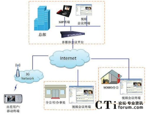 本系統(tǒng)通常將會(huì)議系統(tǒng)安裝于公司總部,應(yīng)用服務(wù)器與媒體服務(wù)器全部實(shí)現(xiàn)雙掛,同時(shí)接入公司內(nèi)網(wǎng)和公網(wǎng)。各分公司安裝的視頻數(shù)據(jù)會(huì)議終端、SIP話機(jī),通過Internet或?qū)>聯(lián)接到總部會(huì)議服務(wù)器的公網(wǎng)出口。公司內(nèi)部辦公室、會(huì)議室的視頻數(shù)據(jù)會(huì)議終端、SIP話機(jī),通過局域網(wǎng)連接到會(huì)議服務(wù)器。會(huì)議服務(wù)器通配合IPPBX、語音網(wǎng)關(guān),接入外線,實(shí)現(xiàn)普通電話和手機(jī)接入會(huì)議。全面支持IP電話和模擬電話。當(dāng)遠(yuǎn)程用戶沒有條件進(jìn)行視頻數(shù)據(jù)會(huì)議時(shí),可以單獨(dú)使用音頻,或者音頻+數(shù)據(jù)的方式進(jìn)行會(huì)議,以保證在網(wǎng)絡(luò)條件很差時(shí)也能夠進(jìn)行協(xié)同辦公。本系統(tǒng)采用不同級別的IPPBX或語音網(wǎng)關(guān)直連FXO口接入PSTN市話,保留了傳統(tǒng)的模擬電話線路。