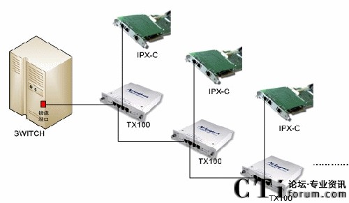 將TX100直接高阻搭接在網(wǎng)絡中的任何位置,兩個Network端口高阻搭接在主干網(wǎng)上,另兩個端口Monitor A和Monitor B將上行數(shù)據(jù)流和下行數(shù)據(jù)流轉(zhuǎn)發(fā)至IPX卡上。