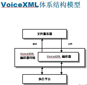 VoiceXML設(shè)計(jì)的工作原理:語音應(yīng)用程序作為系列頁存儲在類似于網(wǎng)絡(luò)服務(wù)器的文件服務(wù)器上。從實(shí)現(xiàn)平臺接收到輸入呼叫時,VoiceXML編譯程序會向文件服務(wù)器發(fā)出一個特定URL請求,就像用戶瀏覽網(wǎng)絡(luò)時輸入網(wǎng)站地址一樣。文件服務(wù)器可以與編譯程序直接相連,也可以設(shè)置在外部,通過本地網(wǎng)或互聯(lián)網(wǎng)的IP協(xié)議訪問。他們可以保持應(yīng)用程序的服務(wù)邏輯,可以提供數(shù)據(jù)庫查找與其他系統(tǒng)操作功能。