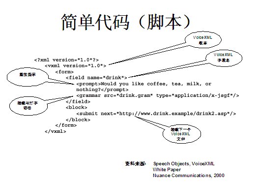 世界上最古老的用戶界面--人類語言終于在二十一世紀(jì)借助于VoiceXML,一種語音可擴(kuò)展標(biāo)記語言發(fā)展成熟起來。作為世界上第一個真正的語音通信標(biāo)準(zhǔn),它定義了應(yīng)用開發(fā)商向用戶提供新型信息訪問服務(wù)的方式。通過這種服務(wù),用戶在任何地方,都可以通過電話或任何移動設(shè)備,虛擬訪問任何信息。VoiceXML正在被廣泛應(yīng)用于旅游、金融與信息服務(wù)等行業(yè)的各種業(yè)務(wù)領(lǐng)域中,甚至是政府部門與市政機(jī)構(gòu),全球的無線運(yùn)營商等。