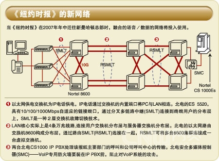 VoIP架構(gòu)是基于北電的通信服務(wù)器CS 1000平臺(tái),該平臺(tái)是一種基于服務(wù)器的IP PBX。CS 1000是基于北電的Meridian PBX特性集合,其主機(jī)運(yùn)行在一臺(tái)來(lái)自WindRiver系統(tǒng)公司的VxWorks實(shí)時(shí)操作系統(tǒng)的IP服務(wù)器上。一對(duì)冗余的CS1000將為新聞、廣告、發(fā)行和其他部門(mén)中大約3600 部IP電話以及部署在《紐約時(shí)報(bào)》的分類(lèi)/顯示廣告呼叫中心的300部IP軟電話提供服務(wù)。CS 1000提供對(duì)34臺(tái)以上的媒體網(wǎng)關(guān)和18臺(tái)信令服務(wù)器(部署在網(wǎng)絡(luò)中為內(nèi)網(wǎng)連接的不同部門(mén)提供VoIP呼叫建立和信令的分布式專用設(shè)備)的集中管理。