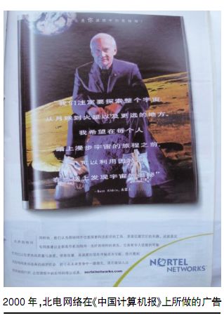 2000年,北電網(wǎng)絡(luò)在《中國計(jì)算機(jī)報(bào)》上所做的廣告  1995年,北電開始從電話制造公司向網(wǎng)絡(luò)設(shè)計(jì)、構(gòu)建及集成公司的演變。起初,業(yè)界分析人士對此予以奚落,認(rèn)為這是一家電信商膚淺的裝飾門面之舉。一位分析師曾尖銳地稱之為“一群四十多歲的人穿著跳迪斯科的衣服”。