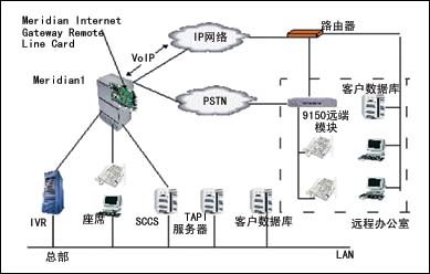 采用北電網(wǎng)絡(luò)的RemoteOffice解決方案。對(duì)于主叫用戶,與原來(lái)的撥號(hào)方案完全一樣;對(duì)于話務(wù)員座席,只是將交換機(jī)的數(shù)字座席通過(guò)廣域網(wǎng)或者專線方式連到遠(yuǎn)端。該方案在呼叫中心的PBX上安裝北電的Meridian