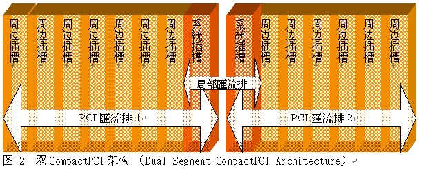 PICMG 2.0 CompactPCI系統(tǒng)是由一組或多組CompactPCI 總線所組成,每個總線最多可達8個CompactPCI板卡插槽,其中包含一個系統(tǒng)插槽(system slot)與最多達7個外圍插槽(peripheral slot)。PCI總線是作為該總線內(nèi)插槽之間的主要通訊途徑,在這個架構(gòu)下,PCI總線與系統(tǒng)插槽是一個可能的故障單點,故障的周邊插槽會讓整個PCI總線停止作用而阻礙了其它任一插槽之間的通訊。這種故障單點成為CompactPCI采用高可靠度應(yīng)用的一個主要障礙,早期的CompactPCI 高可靠度系統(tǒng)架構(gòu)必須克服PCI總線單點故障的限制,典型的解決方法則是添加第二個CompactPCI 總線且讓此二個總線的功能相同。圖2顯示雙CompactPCI 總線架構(gòu)的范例。