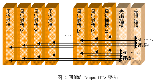 3.0)所定義的系統(tǒng)管理能力、PICMG 2.0所定義的標(biāo)準(zhǔn)機箱(Form Factor)及PICMG 2.16所定義的數(shù)據(jù)傳輸。這種架構(gòu)將不包含PCI總線,在此架構(gòu)下的系統(tǒng)將能夠支持24個外圍插槽與2個光纖插槽。摒除PCI總線將可降低CompactPCI